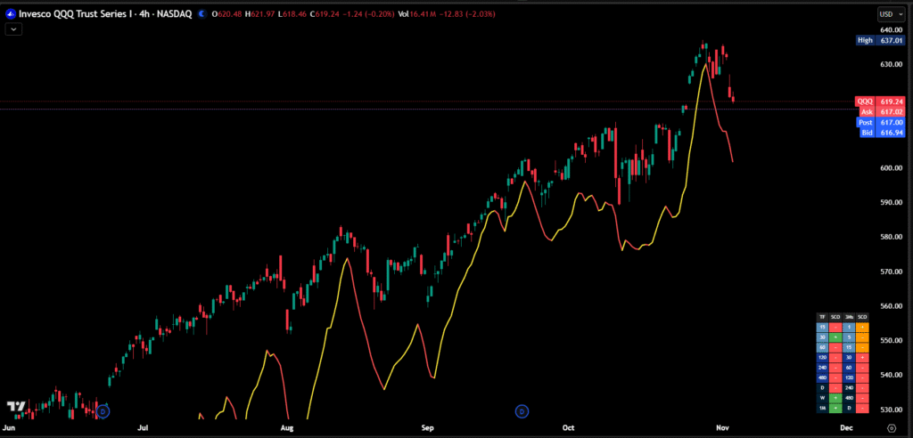 This chart illustrates the behavior of the Scale Convergence Overlay (SCO) line plotted over price, highlighting moments of structural agreement (yellow) and divergence (red). This example is provided to demonstrate the tool’s alignment behavior across timeframes. It is not a recommendation or predictive indicator